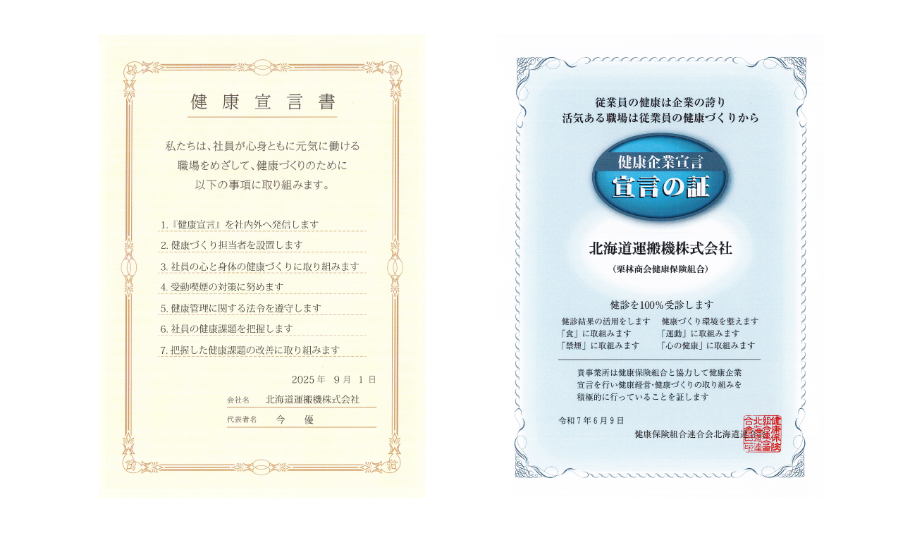 北海道運搬機は、従業員の健康は企業の誇りであり、活気ある職場は従業員の健康づくりからを念頭に、従業員が心身ともに元気に働ける職場を目指して健康づくりに取り組みます。